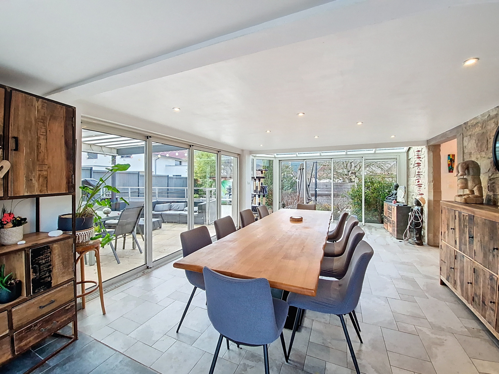 Au RDC, une entrée dessert une salle de bain récente, un WC indépendant et un grand dressing aménagé. Dans le prolongement de l'entrée, on trouve un salon cosy avec poêle à bois, une cuisine moderne et conviviale installée en 2020, ainsi qu'une superbe véranda baignée de lumière, véritable coeur la maison tournée vers l’extérieur. Celle-ci s’ouvre sur la terrasse couverte avec pergola bioclimatique, la piscine chauffée (8 x 4 m, traitement au sel), et le jardin/potager clos, avec cabanon.